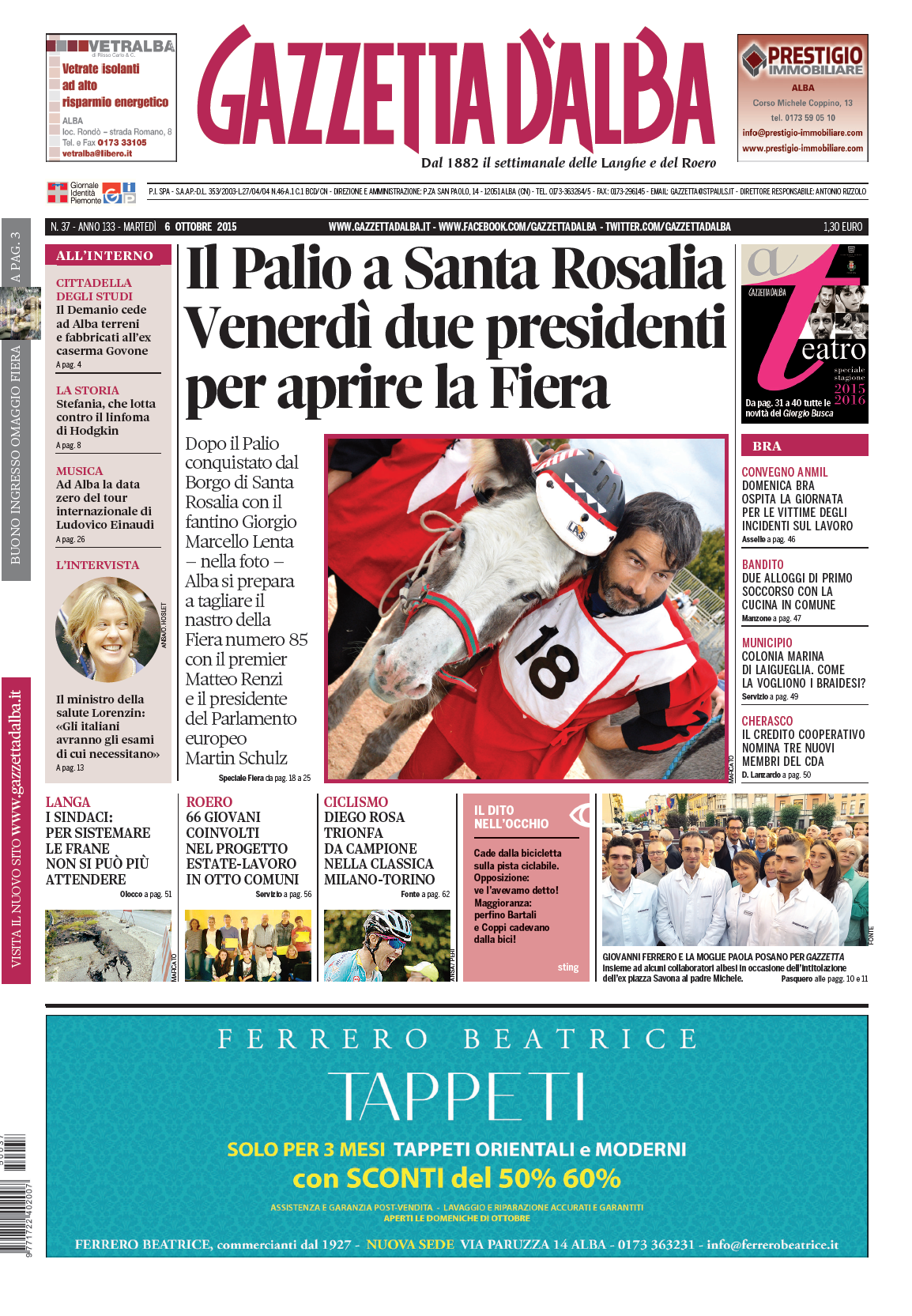 La copertina di Gazzetta d’Alba del 6 ottobre 2015 5 Ottobre 2015 Alba, Primo Piano Versione accessibile ALBA La copertina del numero 37 di Gazzetta d’Alba, disponibile in edicola e in formato digitale a partire da martedì 6 ottobre 2015. anteprimaCopertina