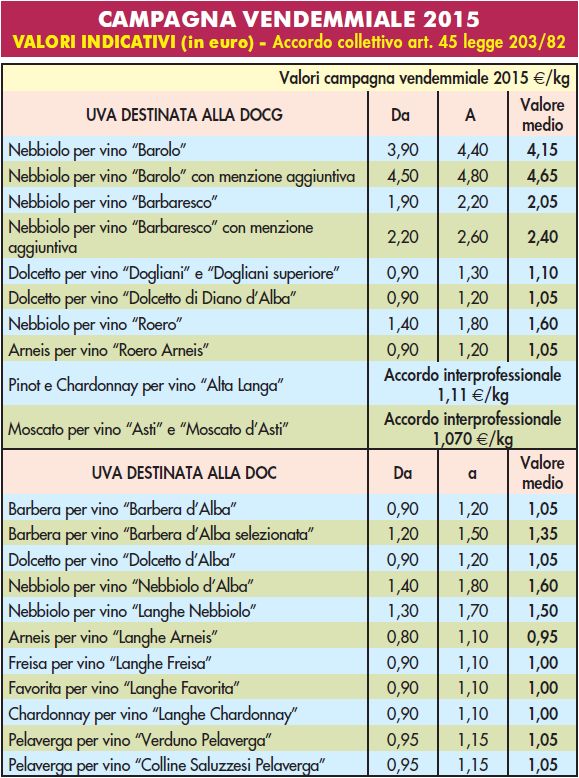 Va detto, innanzitutto, che la qualità delle uve 2015 e la domanda di mercato particolarmente dinamica hanno portato a un generale incremento dei prezzi indicativi, con alcuni casi davvero eclatanti: il prezzo medio delle uve Nebbiolo da Barolo è passato da 3,15 a 4,15 euro a chilo con un aumento del 30% circa; netto il balzo anche per il Barbaresco (da 1,40 a 2,05), del Nebbiolo d’Alba e del Roero (da 1,15 a 1,60), del Langhe Nebbiolo (da 1,05 a 1,50). Anche le uve Dolcetto, che negli ultimi anni avevano segnato il passo, hanno fatto registrare un bell’incremento. L’unica voce fuori dal coro è quella del Langhe Favorita, il cui prezzo indicativo tra 2014 e 2015 è rimasto inalterato (1 euro al chilogrammo di uva).