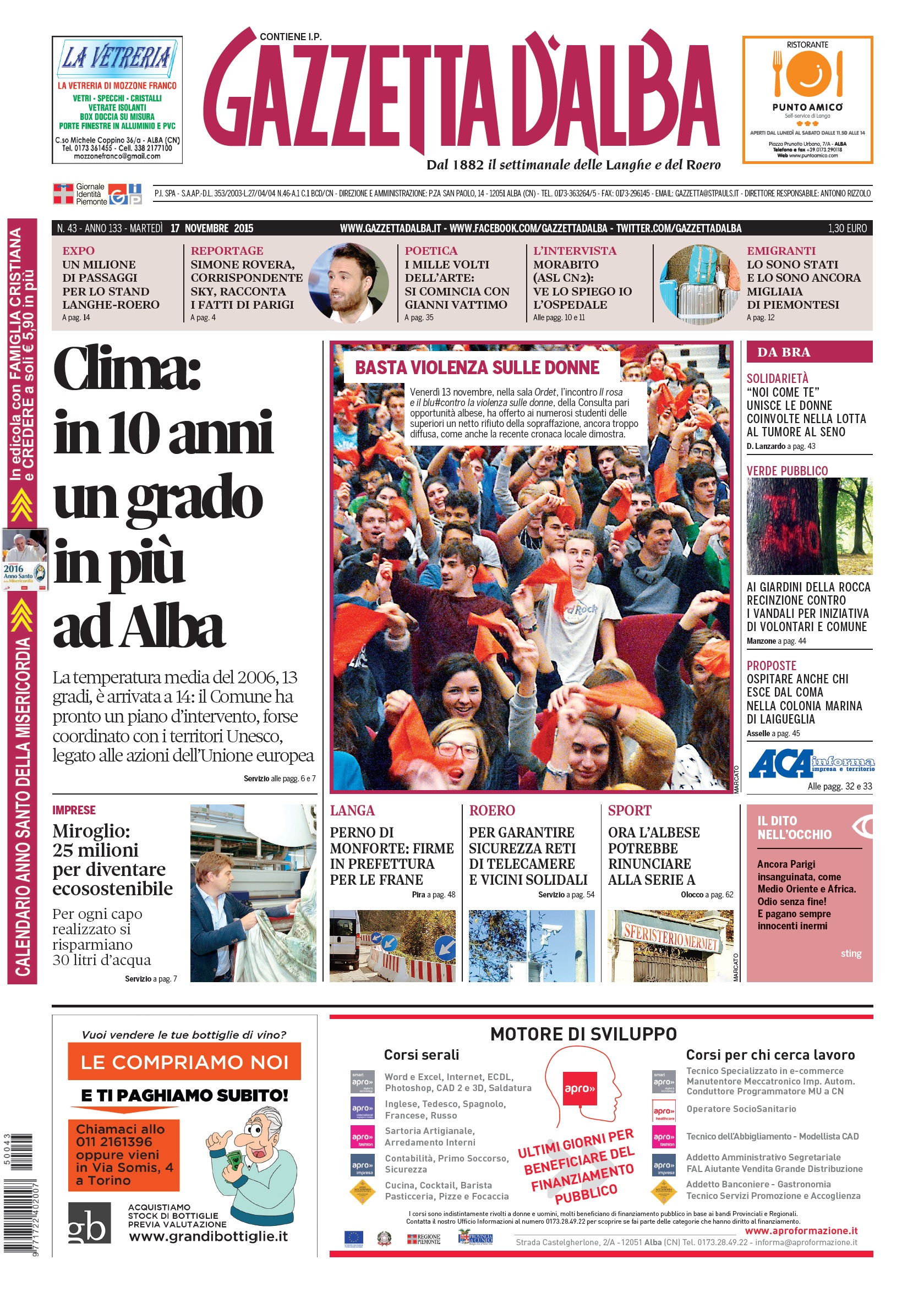 La copertina di Gazzetta d’Alba del 17 novembre 2015 16 Novembre 2015 Alba, Primo Piano Versione accessibile ALBA La copertina del numero 43 di Gazzetta d’Alba, disponibile in edicola e in formato digitale a partire da martedì 17 novembre 2015. anteprimaCopertinaprima pagina