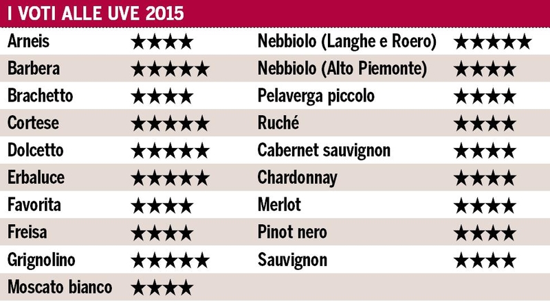 Quanto al dato produttivo 2015, vanno segnalate concrete differenze rispetto ai valori previsionali dell’estate scorsa. Se in fase di previsione si pensava a un incremento produttivo dell’8-10% rispetto al 2014, a vendemmia ultimata l’aumento è ben ridimensionato. I dati ufficiali della Regione parlano di una produzione di 2.466.919 ettolitri, ovvero solo il 2,74 in più dell’anno scorso. Infine, le stelle alle uve. Anche quest’anno, a seguito del lavoro di verifica della maturazione, il gruppo tecnico ha definito il punteggio-qualità per ogni vitigno: i voti sono molto alti, praticamente almeno 4 stelle per tutti i vitigni (ottimo) con alcune performance di eccellenza (5 stelle) per Nebbiolo, Barbera, Dolcetto, Erbaluce, Cortese e Grignolino.