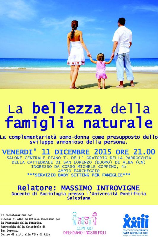 ALBA Venerdì 11 dicembre alle 21 nell’Oratorio della Parrocchia della Cattedrale di San Lorenzo di Alba si terrà un incontro-dibattito dal titolo “La bellezza della famiglia naturale – La complementarietà uomo-donna come presupposto dello sviluppo armonioso della persona”. Il relatore sarà Massimo Introvigne, sociologo, filosofo, fondatore e direttore Cesnur.