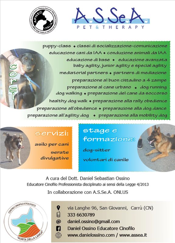 «Adesso anche il cuneese può vantare la presenza di un centro etologico in cui cani e proprietari possono sentirsi a casa» dice l’educatore cinofilo Daniel Sebastian Ossino. «Un grandissimo terreno recintato con ampio parcheggio, attrezzature, giochi e strumenti educativi, ma anche un alloggio studiato appositamente a misura di cane per far sentire voi e il vostro amico a quattro zampe accolti in una grande famiglia». Il centro si pone l’obiettivo di creare uno spazio in cui sia possibile svolgere attività insieme al vostro cane in sicurezza, avvalendosi dell’aiuto di professionisti del settore. Completano i servizi un asilo diurno, in cui i vostri cani sono liberi di socializzare con i loro simili, ma anche un ricco programma di serate informative, stage, eventi e workshop.