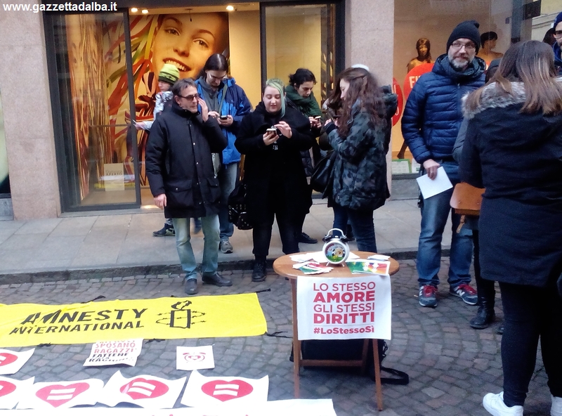 ALBA Sabato 23 gennaio anche ad Alba i sostenitori delle unioni civili sono scesi in piazza chiedendo al Governo di «svegliarsi» e «riconoscere diritti uguali per tutti». All’iniziativa promossa dal collettivo De-Generi e appoggiata dal gruppo albese di Amnesty International e dal circolo Arci Cinema Vekkio ha aderito anche il Movimento 5 stelle, che nel luglio del 2014, pochi giorni dopo l’insediamento in Consiglio comunale, aveva presentato un’interrogazione finalizzata all’istituzione di un registro comunale delle coppie di fatto.