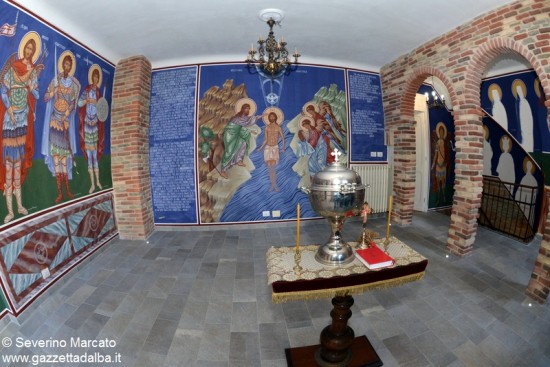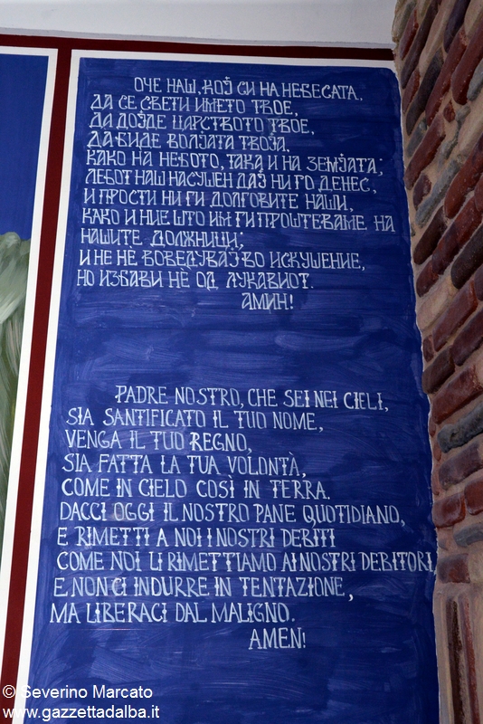 Per la realizzazione di questa cappella i sindacati Fai e Cisl di Cuneo hanno devoluto un’offerta, e nello spirito di fratellanza tra la comunità ortodossa e quella cattolica, tra gli affreschi sono stati scritti il Credo e il Padre nostro, sia in lingua macedone sia in italiano.