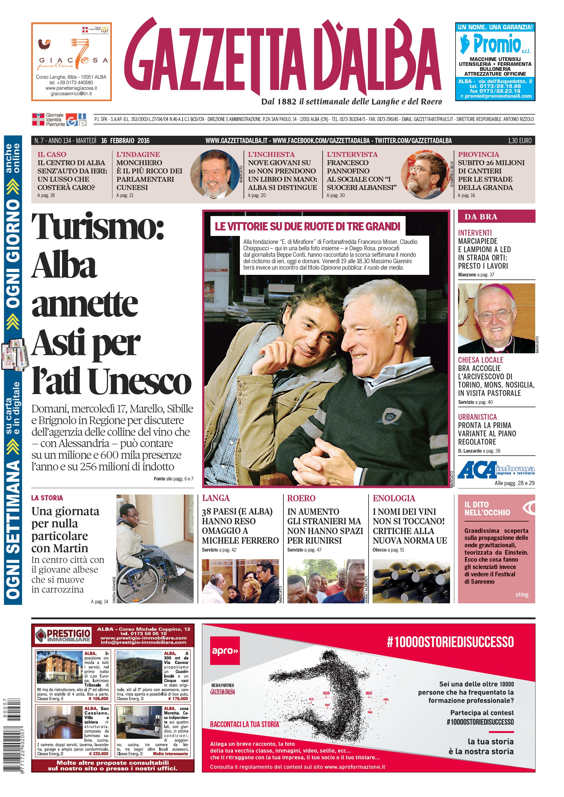 La copertina di Gazzetta d’Alba del 16 febbraio 2016 15 Febbraio 2016 Alba, Primo Piano Versione accessibile ALBA La copertina del numero 7 di Gazzetta d’Alba, disponibile in edicola e in formato digitale a partire da martedì 16 febbraio 2016. Copertinaprima pagina