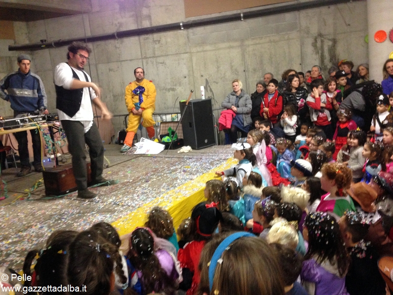 martedì grasso a Mussotto (16) Il mago Bingo e, sullo sfondo, Giovanni Saglietti, presidente del circolo Acli, travestito da pulcino