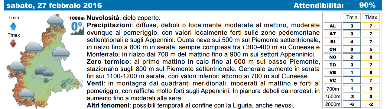 Sabato 27 allerta arancione, moderata (quella massima è indicata con il rosso, mentre quella ordinaria con il giallo), per neve sul settore occidentale e sul cuneese a causa degli ingenti quantitativi attesi dal pomeriggio, con quota delle nevicate intorno ai 300-400 m. Allerta gialla per neve sulle pianure meridionali e sul settore alpino nord occidentale. Sono attesi fino a 60-80 cm di neve sulle zone montane in 24 ore e punte fino a 30-40 cm nelle zone pianeggianti del cuneese. I quantitativi di neve attesi sul settore montano sudoccidentale, dalle Alpi Cozie alle Alpi Liguri, determineranno un aumento del pericolo valanghe, che raggiungerà il grado 4–Forte il pomeriggio di sabato.