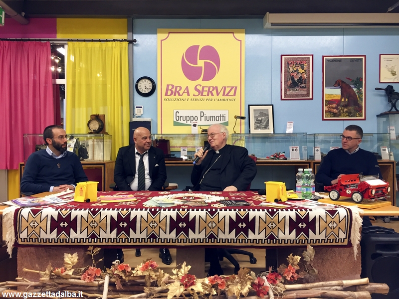 BRA Prosegue a Bra la visita pastorale dell’arcivescovo della diocesi di Torino, Cesare Nosiglia, che nel pomeriggio di venerdì 11 marzo ha visitato lo stabilimento di Bra Servizi incontrando il patron Giuseppe Piumatti e la sua famiglia. Nell’occasione ha riflettuto sulla necessità che gli imprenditori e le aziende non perdano di vista gli aspetti etici e la centralità degli uomini rispetto al profitto. Giuseppe Piumatti ha dichiarato: «Da ex allievo salesiano sono stato cresciuto da persone che mi hanno sempre fatto sentire la Chiesa non solo vicina ma direttamente parte della mia quotidianità e avere in visita l’Arcivescovo è un onore e un riconoscimento per tanti sacrifici». Ha aggiunto Sonia Piumatti: «Bra Servizi è una grande famiglia e rappresenta la vera società italiana. Persone vere, perlopiù giovani e donne impegnati nel lavoro e in una forte crescita personale e formativa».