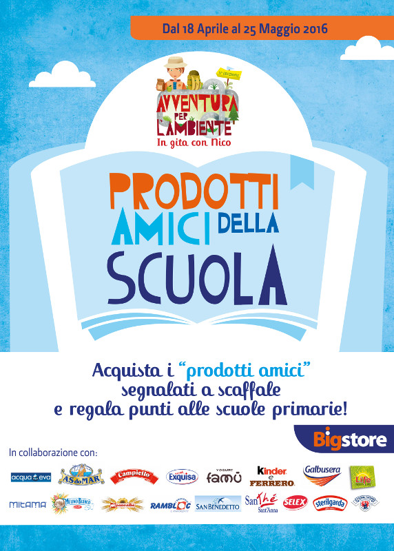ALBA Nell’ambito del progetto didattico Avventura per l’ambiente, promosso dagli ipermercati Bigstore e dedicato alle scuole primarie, dal 2013 è attiva l’iniziativa Bottiglia riciclata, scuola premiata e dopo il successo del 2015, ritornano anche i Prodotti amici della scuola, un’operazione che si aggiunge alla raccolta delle bottiglie in pet e consolida l’alleanza scuola-famiglia-Bigstore.