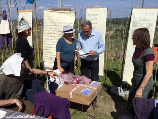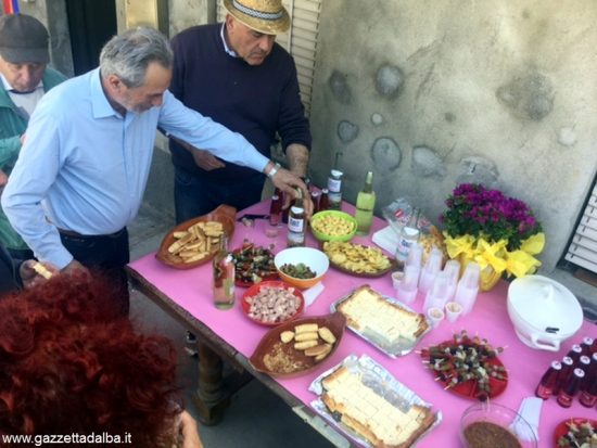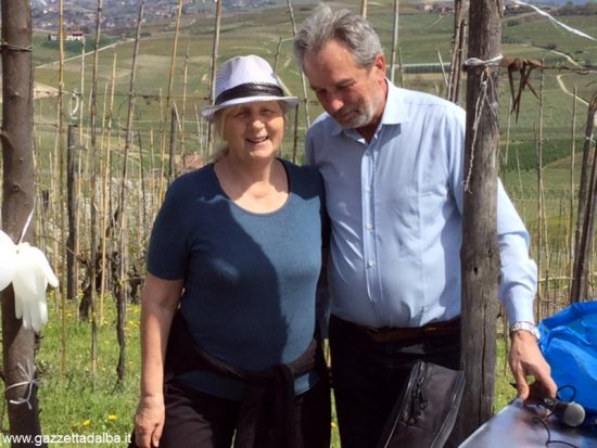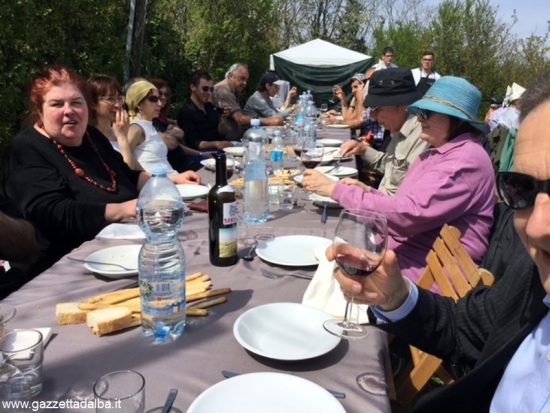 Il ritrovo è avvenuto ieri (domenica 10 aprile) nel cortile di cascina Granera, con un ricco aperitivo. Poi l’allegra comitiva di amici, parenti, animali (tantissimi i cani presenti) si è messa in fila indiana per raggiungere la sommità della collina, lungo i cui pendii ci sono le sue vigne. Giunti in cima, oltre a godere di una spettacolare vista sul Roero, c’erano i tavoli apparecchiati, con i camerieri pronti e la musica della fisarmonica e della chitarra che disegnavano un clima di festa.