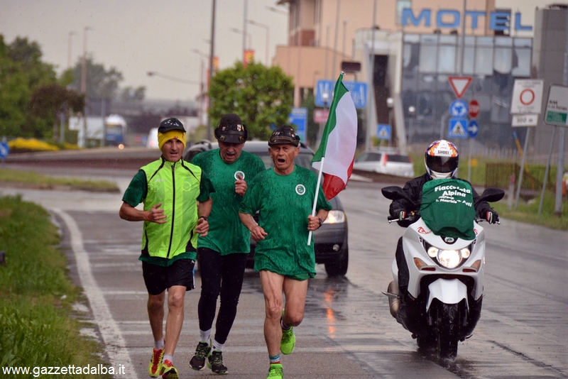 ASTI La pioggia non ha fermato la staffetta degli Alpini partita giovedì mattina dal sacrario di San Maurizio di Cervasca e diretta ad Asti per l’Adunata nazionale. Accompagnati dalla Polizia di Stato e da alcuni Alpini motociclisti, i podisti con la fiaccola hanno percorso 106 chilometri toccando Cervere, Bra, Cinzano, Alba, Vaccheria, Canove di Govone, Motta di Costigliole e Isola d’Asti e rendendo omaggio ai vari monumenti agli Alpini dei paesi attraversati.