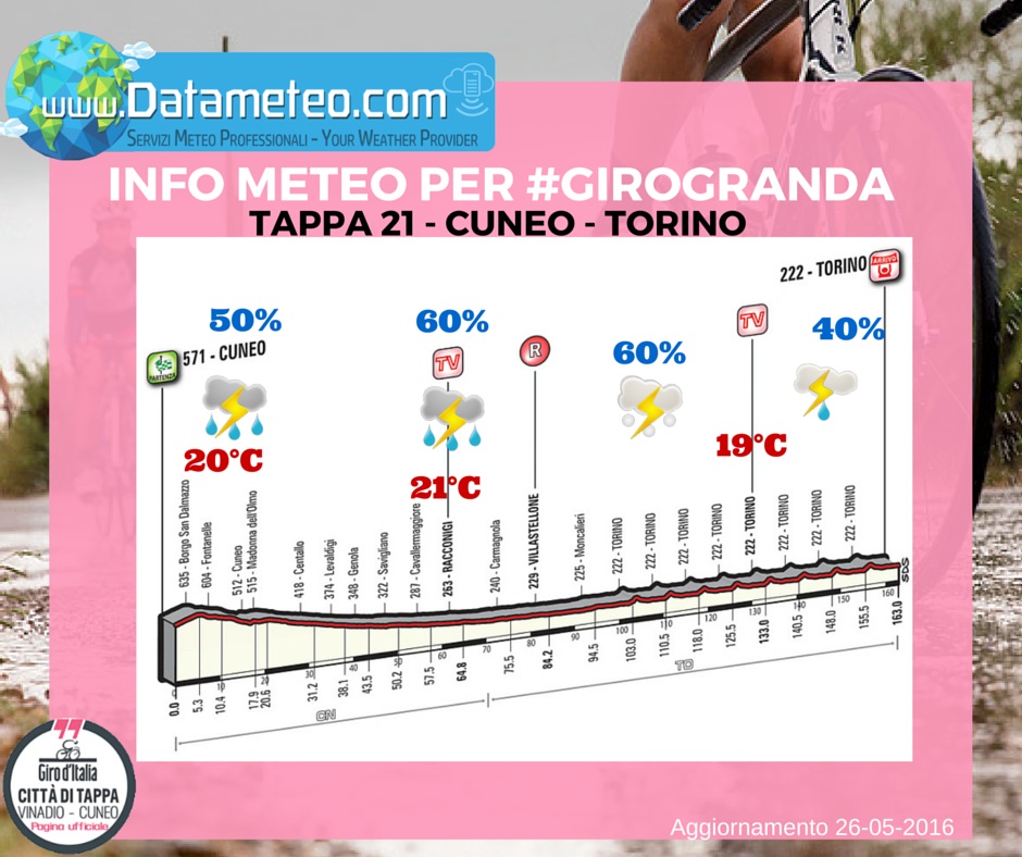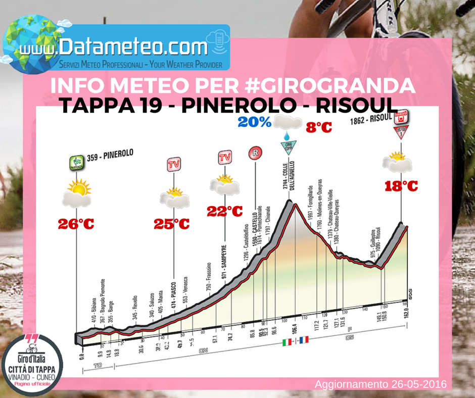 ALBA Di seguito riportiamo il bollettino meteo regionale preparato dal provider cuneese Datameteo.com per le tappe del Giro d’Italia che interesseranno la Granda.