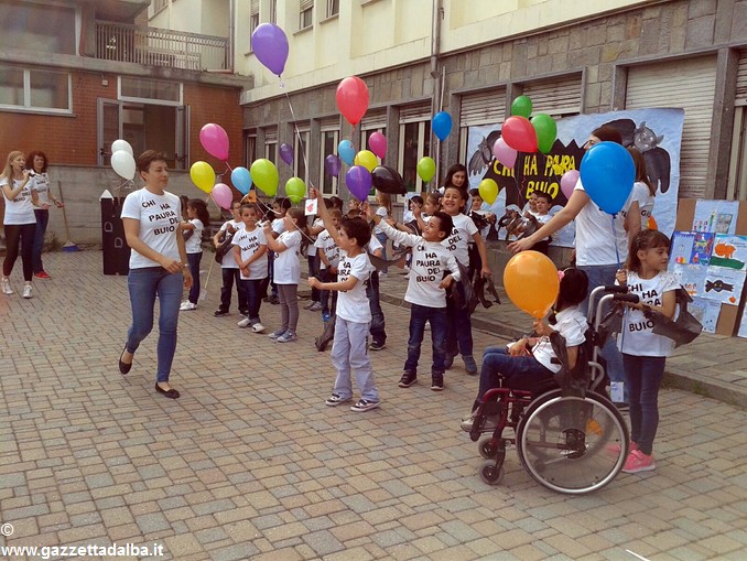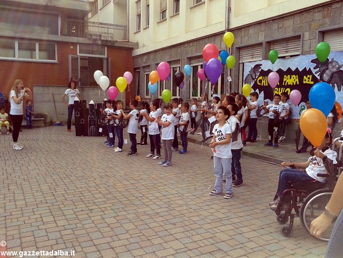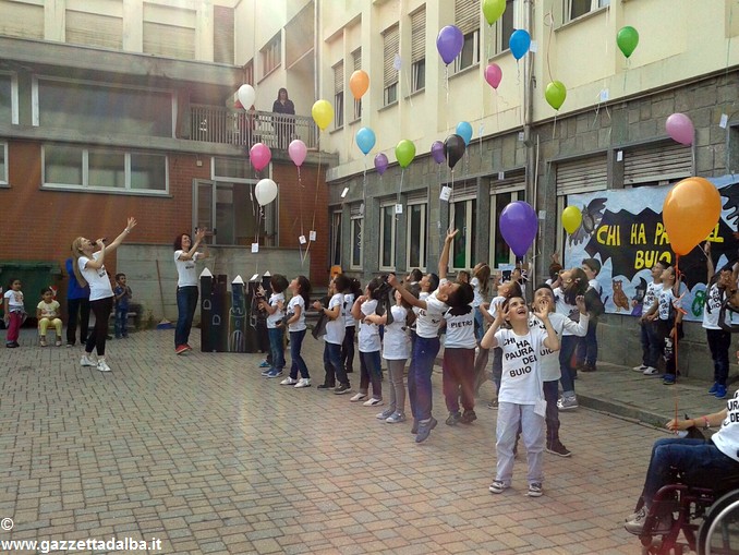 Dopo l’introduzione della dirigente Maria Luisa Rivetti, i primi ad intervenire sono stati i bambini di cinque anni della scuola dell’infanzia statale che hanno proposto due canti sul tema Chi ha paura del buio…, concludendo con il lancio dei palloncini contenenti messaggi di pace.