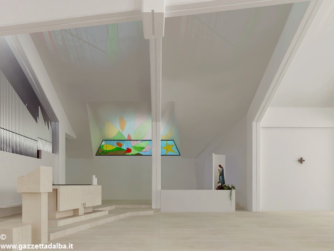 Anche tutte le travi, ora in cemento a vista, verranno imbiancate con uno strato di calce rasante. Infine, verranno rifatte le vetrate: saranno colorate e studiate in modo da consentire alla luce di entrare con molta più efficacia.