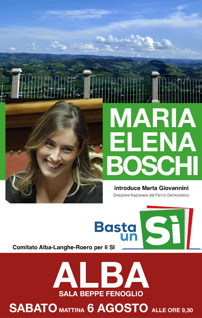ALBA Nella mattinata di sabato 6 agosto, alle ore 9,30, nella sala Beppe Fenoglio (cortile della Maddalena, ingresso da via Vittorio Emanuele) il Ministro per le riforme istituzionali Maria Elena Boschi sarà ad Alba per sostenere le ragioni del sì al Referendum costituzionale dell’autunno.