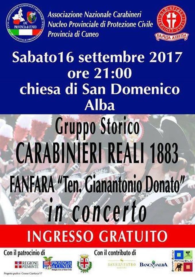 A conclusione delle manifestazioni sabato sera, in San Domenico, si terrà il conserto della fanfara del gruppo storico Carabinieri reali 1883 assieme al gruppo storico con divise dei carabinieri reali dell’anno 1883.