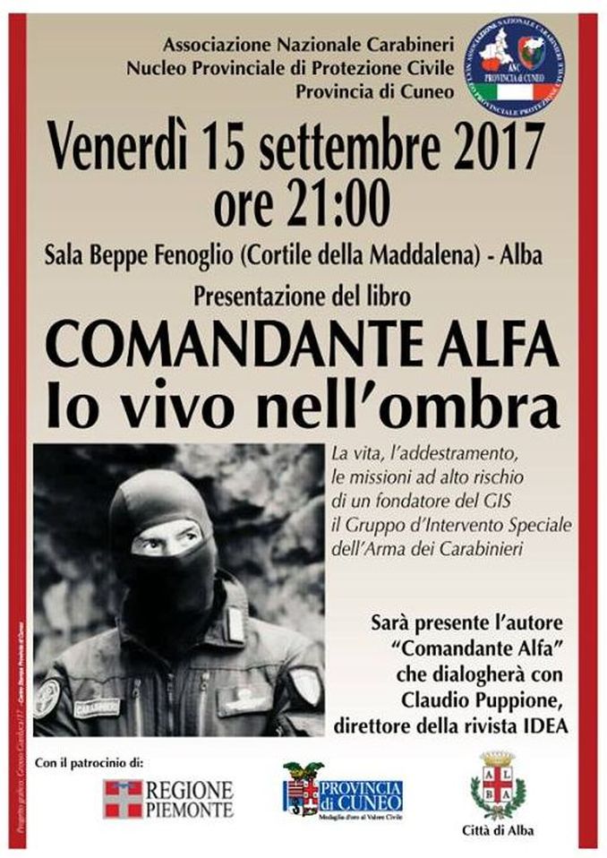 ALBA Questa sera, venerdì 15 settembre, alle 21 in sala Beppe Fenoglio verrà presentato il libro Io vivo nell’ombra, scritto dal comandante Alfa, uno dei fondatori del Gruppo di intervento speciale dell’arma dei Carabinieri noto con l’acronimo Gis. L’iniziativa rientra nella serie di eventi organizzati dal nucleo provinciale di protezione civile dell’Associazione nazionale carabinieri per inaugurare la sede di Alba, in corso Enotria 6.