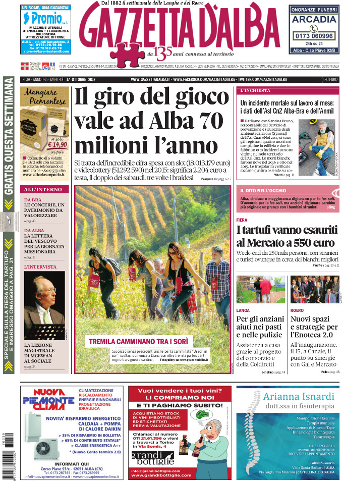 ALBA La prima pagina del numero 39 di Gazzetta d’Alba, che sarà disponibile in edicola e in formato digitale da martedì 17 ottobre.