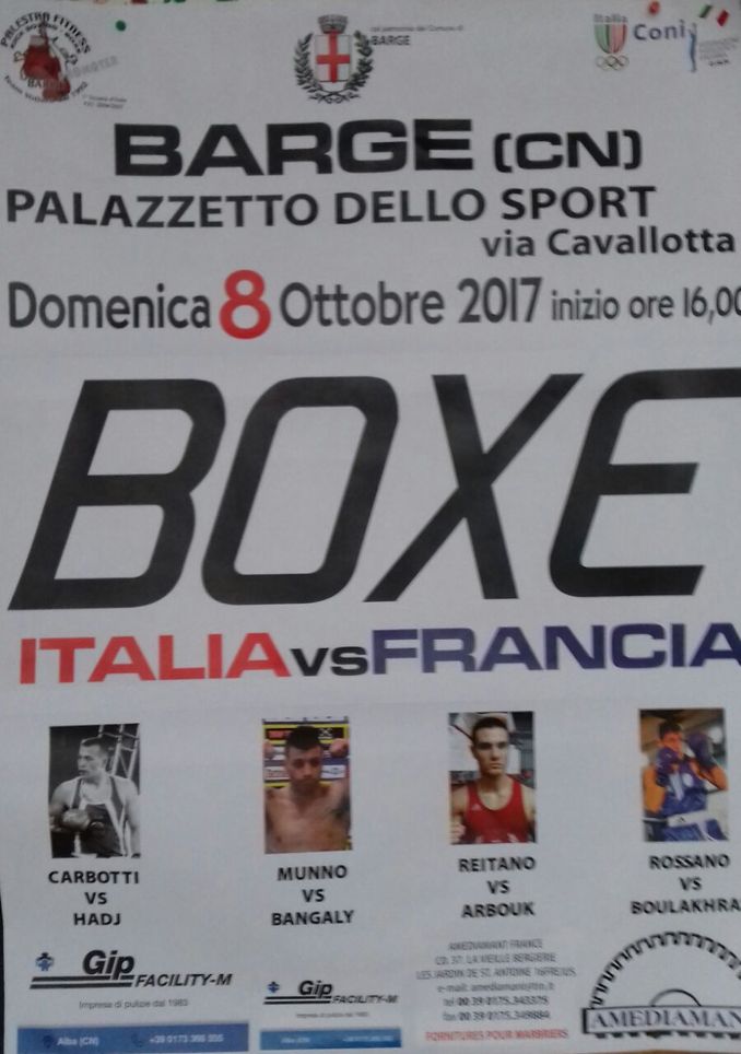 BARGE Il palazzetto dello sport di via Cavallotta a Barge ospiterà domenica 8 ottobre, dalle 16, un incontro di boxe tra una rappresentativa italiana e una francese. Tra i match in programma è molto atteso quello di Fabio Reitano portacolori del team di casa contro il francese Arbouk. Il programma prevede anche gli incontri tra Carbotti e Hadj, Munno e Bangaly e Rossano e Boulakhra