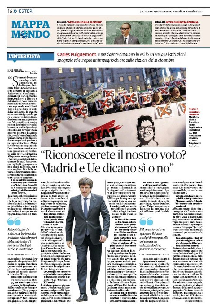Sul Fatto quotidiano di oggi è pubblicata un’intervista a Carles Puigdemont scritta dal giornalista di origine catalana ma albese d’adozione Luis Cabases che è anche stato sindaco di Serralunga.