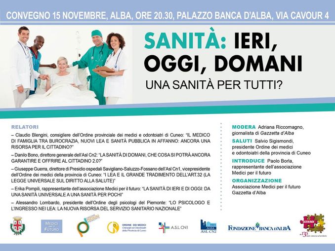 ALBA Nel futuro la sanità riuscirà ancora a soddisfare le esigenze di tutti? Sarà questo l’interrogativo centrale del convegno in programma per mercoledì 15 novembre alle 20.30 al palazzo Banca d’Alba, organizzato dall’associazione Medici per il futuro insieme a Gazzetta.