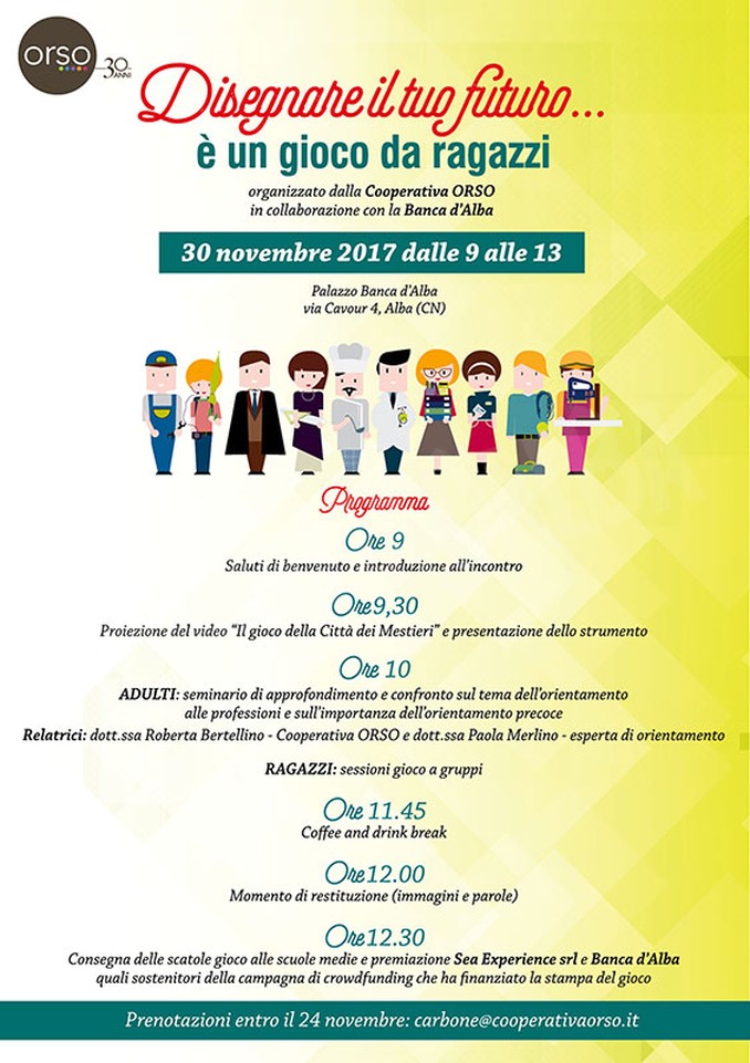 ALBA Si terrà domani, giovedì 30 novembre, dalle 9 alle 12.30 nel palazzo Banca d’Alba in via Cavour 4 ad Alba il convegno “Disegnare il tuo futuro è un gioco da ragazzi”, organizzato nell’ambito delle iniziative per i 30 anni dalla cooperativa Orso in collaborazione con la banca.