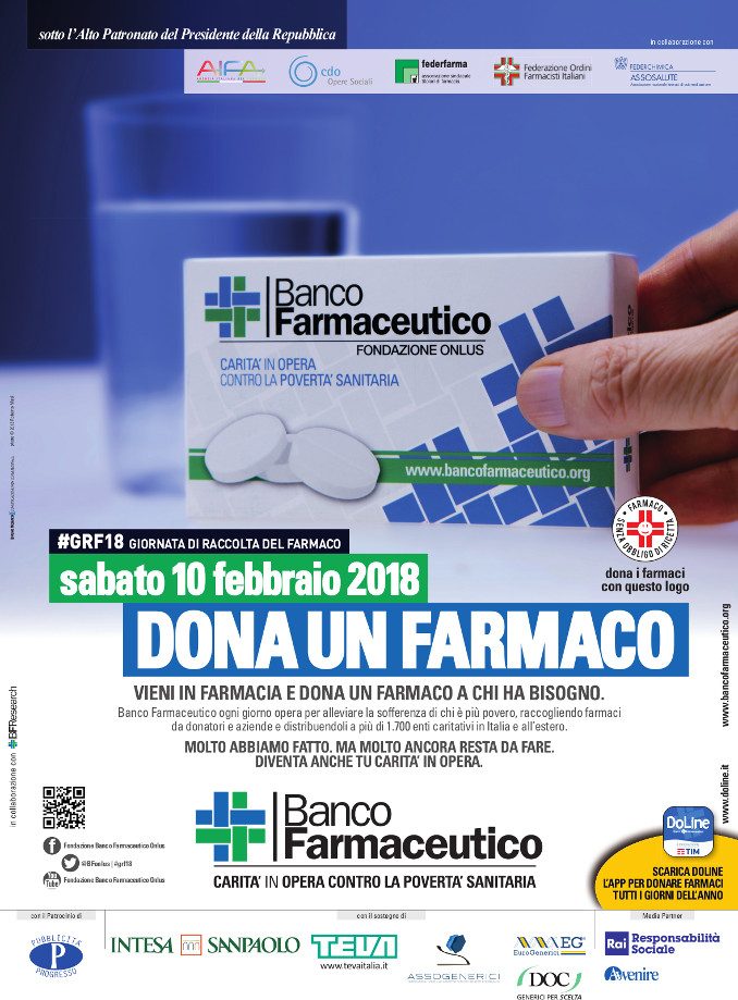 Sabato 10 febbraio si svolgerà la 18ª Giornata nazionale di raccolta del farmaco. Nelle farmacie aderenti si potranno acquistare farmaci per i quali non occorre la prescrizione medica e donarli a chi vive ai limiti della sussistenza. Saranno i volontari della fondazione Banco farmaceutico e i farmacisti stessi a illustrare le modalità della donazione, in base alla domanda degli enti assistiti.