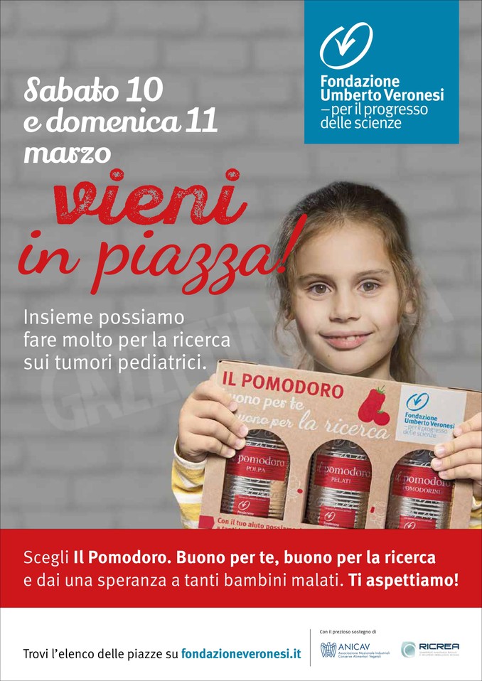 ALBA Sabato 10 e domenica 11 marzo 2018 la fondazione Umberto Veronesi torna nelle piazze di tutta Italia per la prima edizione de “Il pomodoro. Buono per te, buono per la ricerca”, un’iniziativa ideata per raccogliere fondi per finanziare la ricerca scientifica in ambito pediatrico, al fine di garantire le migliori cure possibili ai bambini malati di tumore e aumentare le loro aspettative di guarigione. Il banchetto della fondazione sarà presente ad Alba sabato 10 in piazza Pietro Ferrero e domenica 11 in piazza del Duomo.