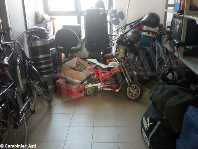 ASTI Durante un servizio di controllo del territorio i carabinieri notavano, in via Secondo Pia, un assembramento di persone intorno a un garage con all’esterno esposte diverse biciclette. I militari provvedevano a identificare e controllare i presenti non riscontrando, nell’immediato, nessuna irregolarità. Successivi accertamenti effettuati su altri garage di proprietà di uno degli appartenenti al gruppo portavano alla luce una specie di negozio di merce molto probabilmente rubata in cui i carabinieri sequestravano: biciclette, utensili da giardinaggio e carpenteria, casse acustiche, caschi da moto e da bici, televisori, sacchi da pugilato, minimoto, snowboard, giochi elettronici, portafogli, borse e cinture con griffe false e perfino una latta da 25 litri d’olio extravergine di oliva.