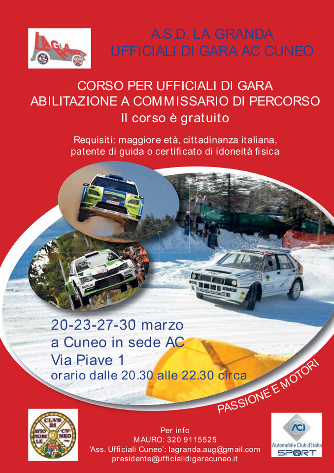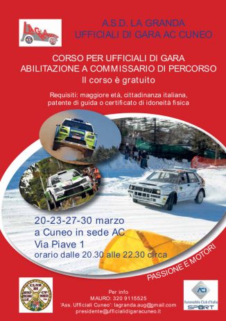 Per i piloti, invece, l’Aci ha in programma un corso gratuito per ottenere la prima licenza. L’appuntamento è nella sede Aci martedì 13 marzo alle 20.30. Le iscrizioni scadono lunedì 12. Per maggiori informazioni è possibile telefonare al numero 334-32.81.104 o scrivere all’indirizzo email ufficiosportivo@acicuneo.it .