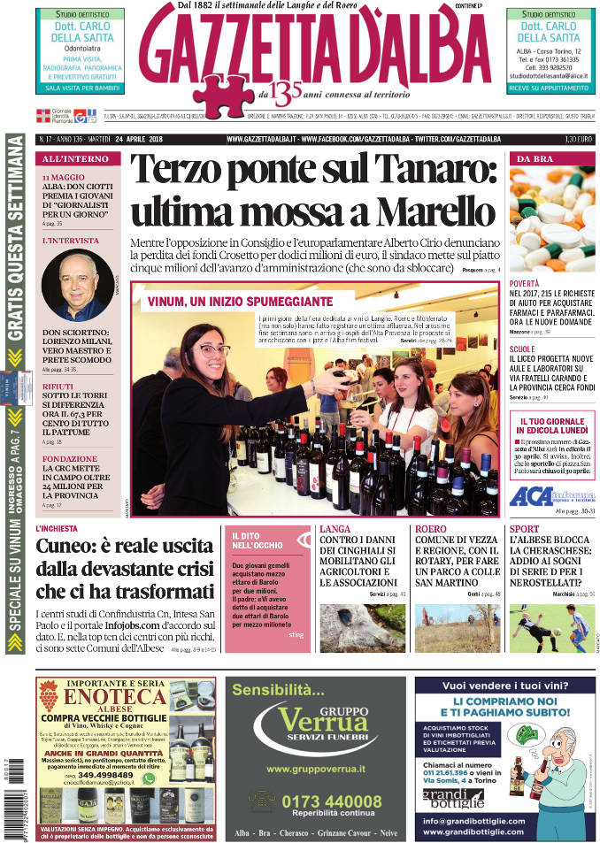 ALBA La prima pagina del numero 17 di Gazzetta d’Alba, che sarà disponibile in edicola e in formato digitale da martedì 24 aprile.