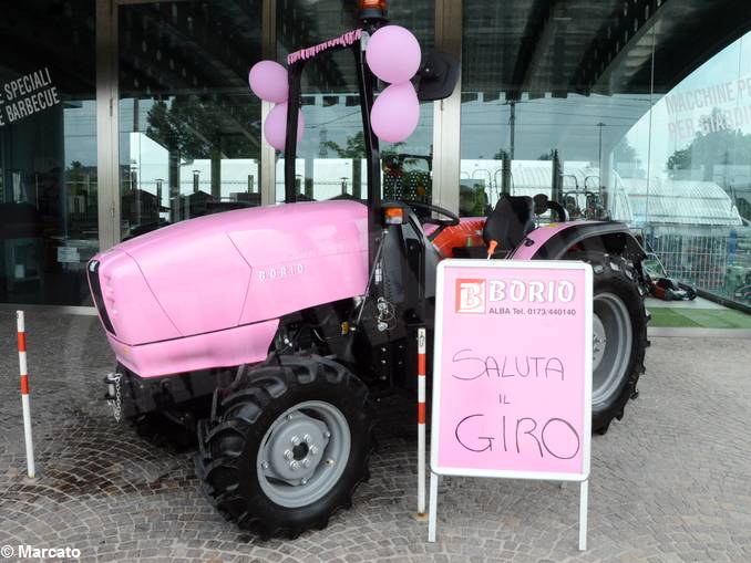 giroitaliaBorio Il trattore rosa che, per iniziativa della ditta Borio, accoglierà i ciclisti all'ingresso di Alba
