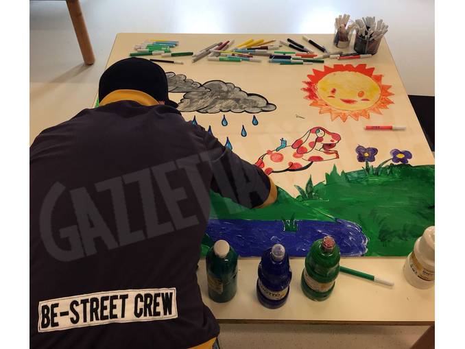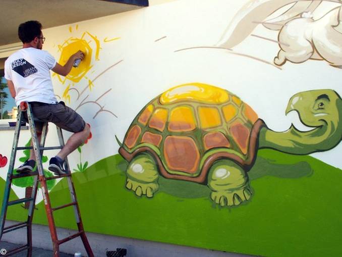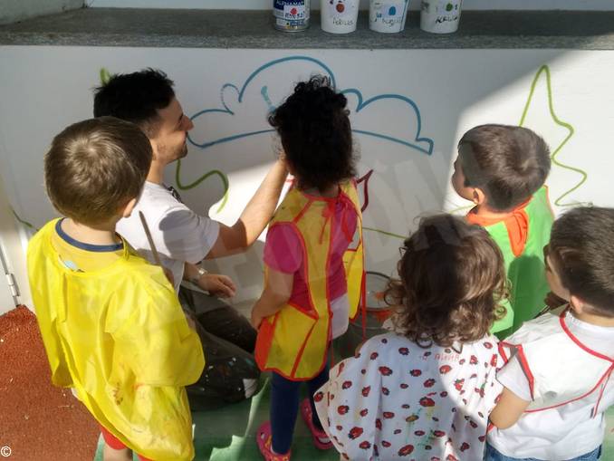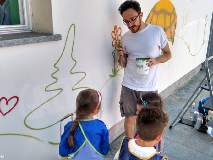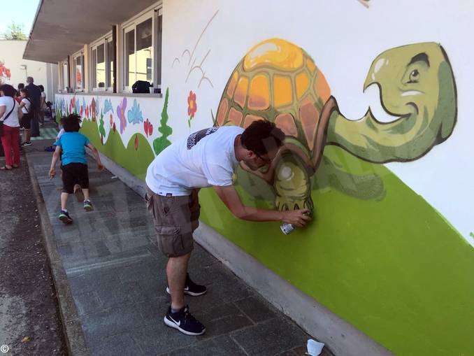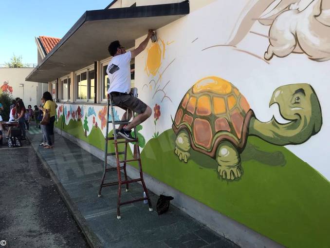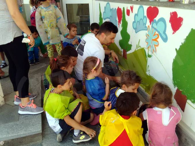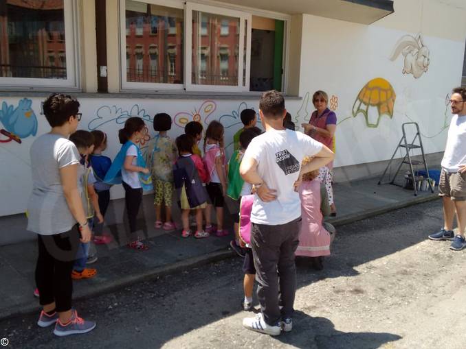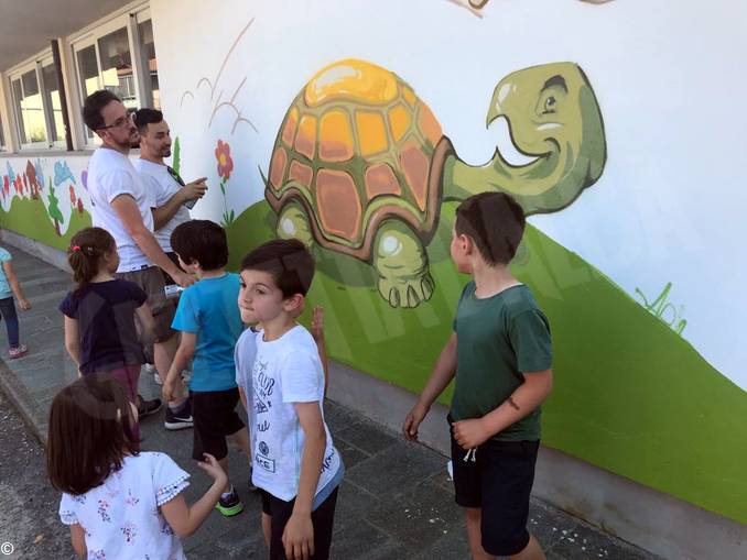 Artisti cuccioli e artisti professionisti hanno così lavorato gli uni vicini agli altri per realizzare le decorazioni e se, in via fratelli Ambrogio, Enrico Signa e Michele Merlo hanno creato insieme ai bambini pannelli in legno, che possono impreziosire l’interno dell’asilo, nella scuola dell’infanzia di via Balbo si è optato per una decorazione esterna, nella quale fiori, orologi, uccellini, nuvole e farfalle disegnati dai bambini incorniciano le pitture le grandi immagini della volpe, della lumaca, del leprotto e della tartaruga realizzate dagli esperti.