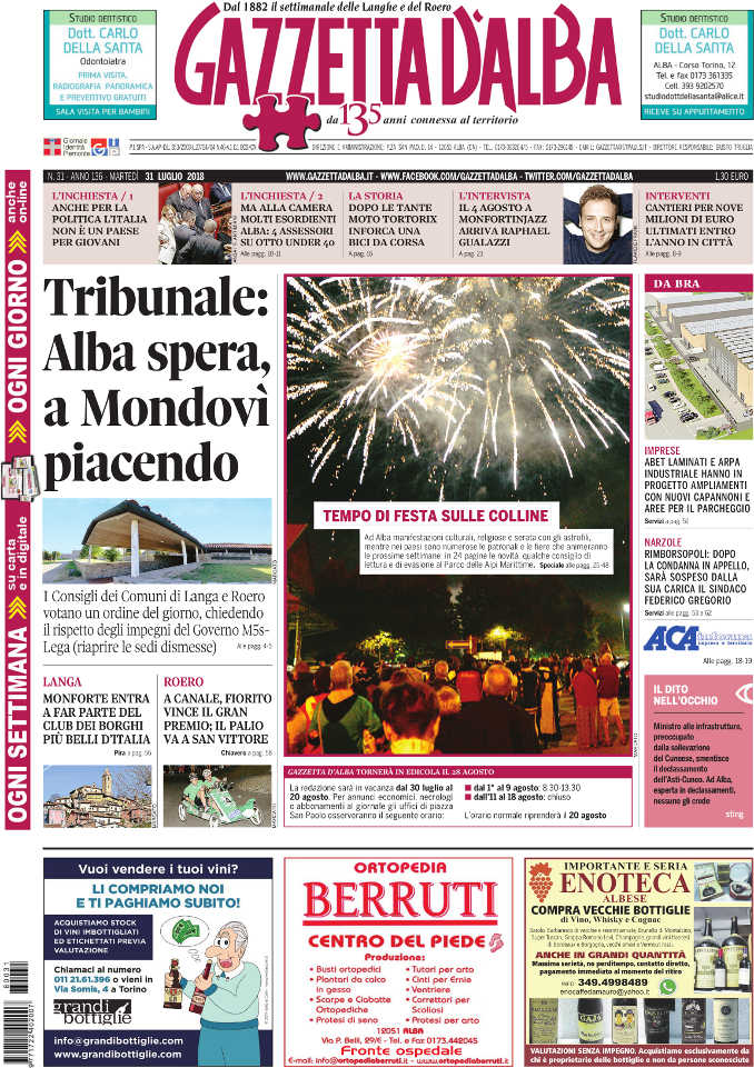ALBA La prima pagina del numero 31 di Gazzetta d’Alba, che sarà disponibile in edicola e in formato digitale da sabato 28 luglio. All’interno del numero 24 pagine speciali con tutti gli appuntamenti di agosto nei paesi di Langa e Roero. Il prossimo numero del giornale sarà in edicola martedì 28 agosto.