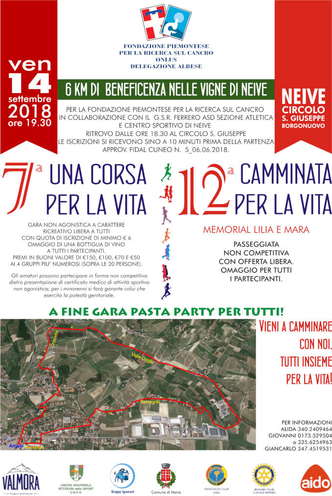 NEIVE Venerdì 14 settembre si svolgerà la 12ª camminata per la vita in ricordo di Lilia Marengo Porta e Mara Peruzzi Agosti, con lo scopo di raccogliere fondi a favore della delegazione albese della Fondazione per la ricerca sul cancro di Candiolo Onlus.