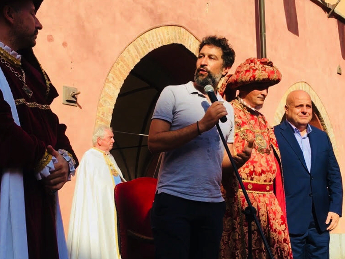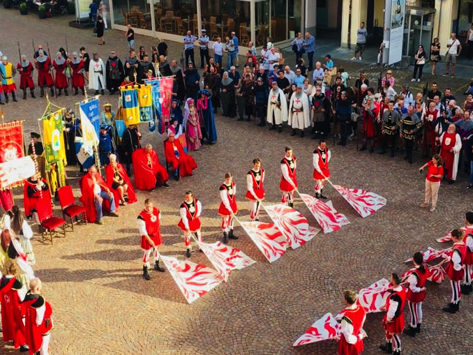 Presenti alla cerimonia, accanto ai borghi e agli sbandieratori e al gruppo storico di Alba, anche gli sbandieratori e i rappresentanti di tutti i rioni di Asti.