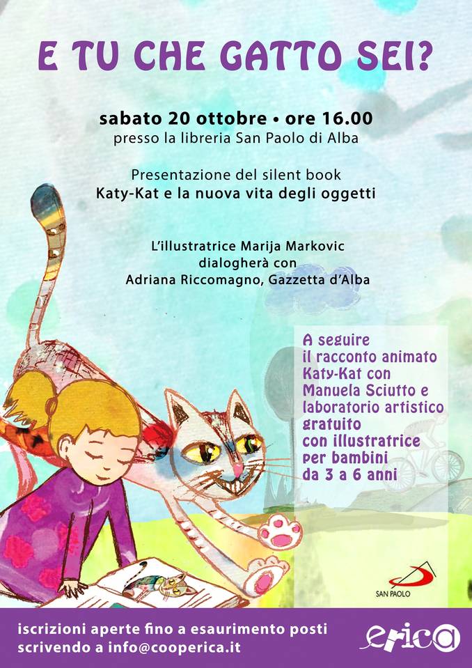 ALBA Sabato 20 ottobre si terrà la presentazione del libro Katy Kat e la nuova vita degli oggetti. Alle ore 16, presso la libreria San Paolo di via Vittorio Emanuele 30 a Alba, sarà presente l’illustratrice Marija Markovic. A seguire si terrà il laboratorio espressivo a cura di Manuela Sciutto e artistico a cura dell’illustratrice. L’attività è riservata per i bambini di età compresa tra i 3 e i 6 anni, per iscriversi inviare un’email a info@cooperica.it