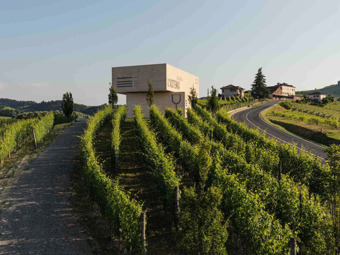 L’architettura dell’edificio si contraddistingue per un’estetica dichiaratamente pop: appoggiata come una scultura sulla dolce collina tra i filari dei vigneti, la cantina è infatti costituita da due grandi volumi sovrapposti, che evocano le forme di due casse da vino fuori scala e ospitano il wine shop a piano terra e la sala degustazioni e ricevimento clienti al primo piano.