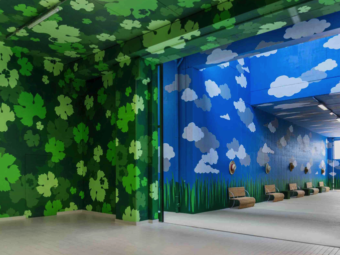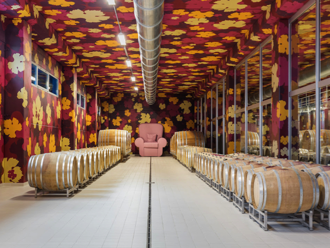 Tradizione e audacia si contrappongono così – idealmente e fisicamente – fondendosi, in tutto il progetto. Infatti, alla pavimentazione che evoca la natura e la tradizione, si contrappongono i soffitti della cantina che presentano grandi dipinti murali, realizzati da artisti locali, dall’estetica pop e surrealista, che creano nel visitatore l’illusione di essere realmente all’interno di una cassa di vino nel momento in cui una mano sta estraendo una bottiglia.