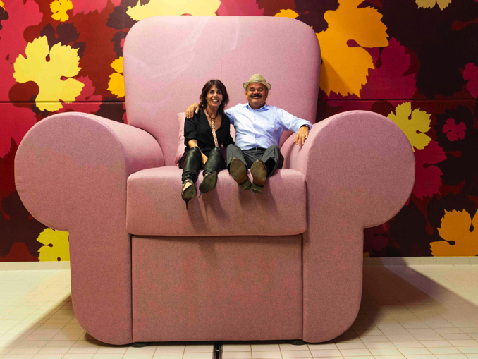 Per l’arredo della cantina, immancabili alcuni dei prodotti iconici di Gufram, come il divano Bocca, il Cactus, ma anche progetti più recenti come la poltrona Roxanne.