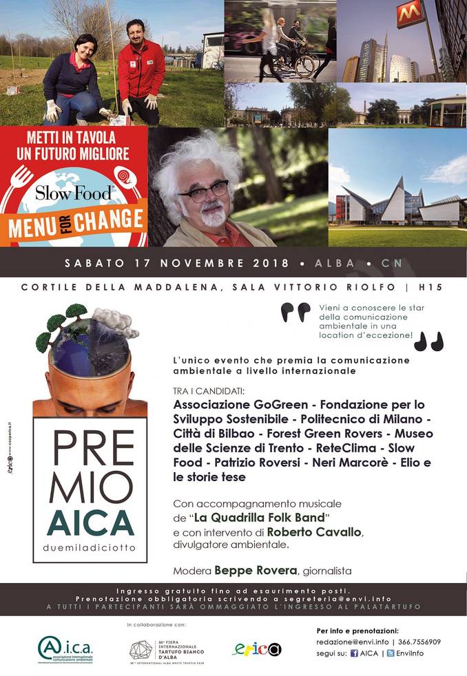 ALBA Il premio Aica – l’Associazione internazionale per la comunicazione ambientale nata ad Alba –, cioè l’Oscar della comunicazione ambientale, sarà consegnato sabato 17 novembre ad Alba, alle 15 nella sala Vittorio Riolfo, all’interno del cortile della Maddalena. Modererà l’incontro l’ex giornalista Rai Beppe Rovera, autore e conduttore di Ambiente Italia, trasmissione del terzo canale. Il pomeriggio sarà introdotto dalla presidente di Aica, Emanuela Rosio; Roberto Cavallo, divulgatore ambientale, alternerà le sue letture con gli interventi musicali della banda folk La quadrilla.