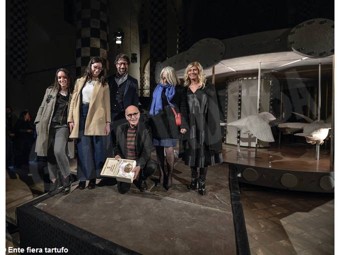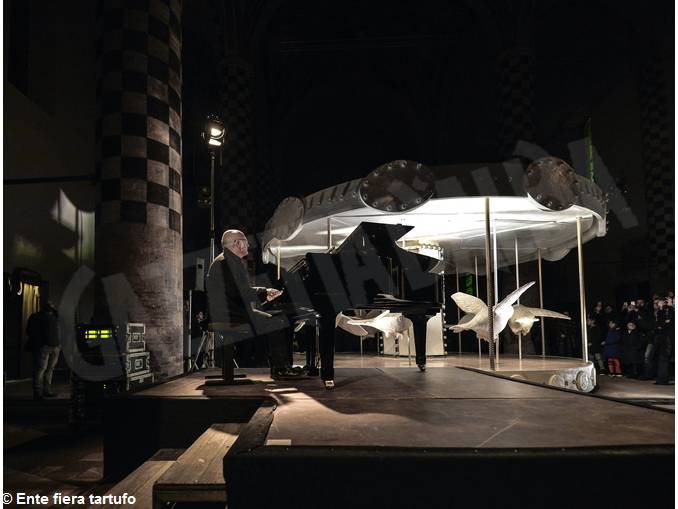 Straordinario successo per la mostra “La storia di Nina” di Valerio Berruti. La personale, a cura di Arturo Galansino allestita nella chiesa di San Domenico, è stata visitata da oltre 50mila persone che hanno potuto ammirare ed interagire con la grande giostra – scolpita dall’artista in ogni suo dettaglio – la cui colonna sonora è stata appositamente realizzata da Ludovico Einaudi. Il grande compositore è stato protagonista assieme all’artista e al curatore di uno straordinario finissage dialogando sul progetto che li vede lavorare in sinergia e interpretando la traccia scritta per il progetto cinematografico di Valerio Berruti realizzato mettendo in sequenza circa 3mila disegni. Per l’occasione la Fiera internazionale del tartufo bianco d’Alba insieme al Comune di Alba hanno consegnato a Ludovico Einaudi “Il tartufo dell’anno” – regalato dalla famiglia Bonino di Tartufi Morra di Alba – ovvero il migliore esemplare di tartufo bianco d’Alba che ogni anno, seguendo l’illuminata intuizione di Giacomo Morra, viene regalato a una personalità del panorama internazionale.