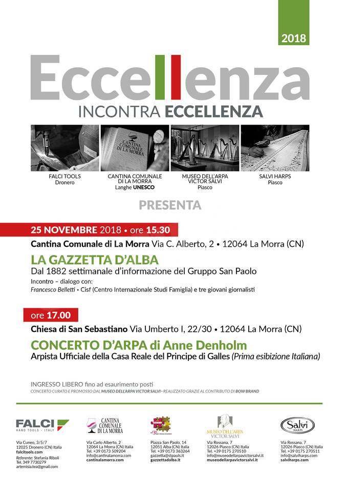 Che cosa sta per accadere? Torna per il terzo anno l’incontro tra le migliori realtà imprenditoriali del Cuneese, un progetto nato nel 2016 dalla Falci Srl di Dronero: questa volta, tra loro, c’è anche il nostro giornale. In Eccellenza incontra eccellenza sono coinvolte inoltre la cantina comunale di La Morra con i suoi settanta barolisti; la Salvi harps, che realizza i magici strumenti musicali nello stabilimento di Piasco, commercializzandoli poi in tutto il pianeta; il museo Victor Salvi, unico al mondo – una vera chicca – dedicato solo all’arpa.