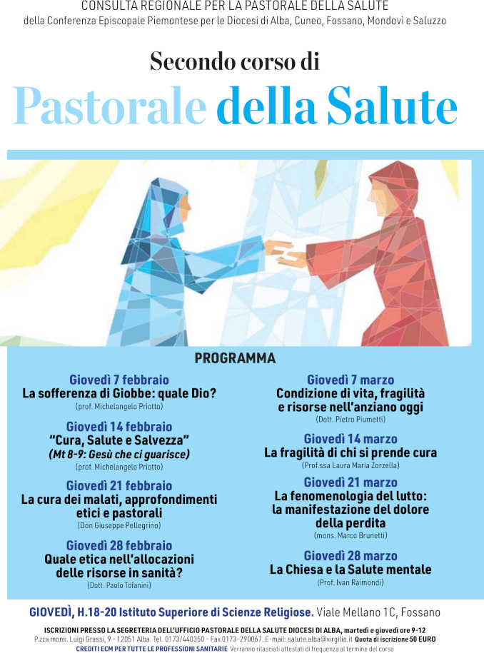 FOSSANO Sono aperte le iscrizioni al secondo corso di Pastorale dalla Salute organizzato dalla Diocesi di Alba, insieme alle altre circoscrizioni vescovili della Provincia – Cuneo, Fossano, Mondovì e Saluzzo -: in programma otto incontri, a Fossano, ogni giovedì dalle 18 alle 20 a partire dal 7 febbraio.