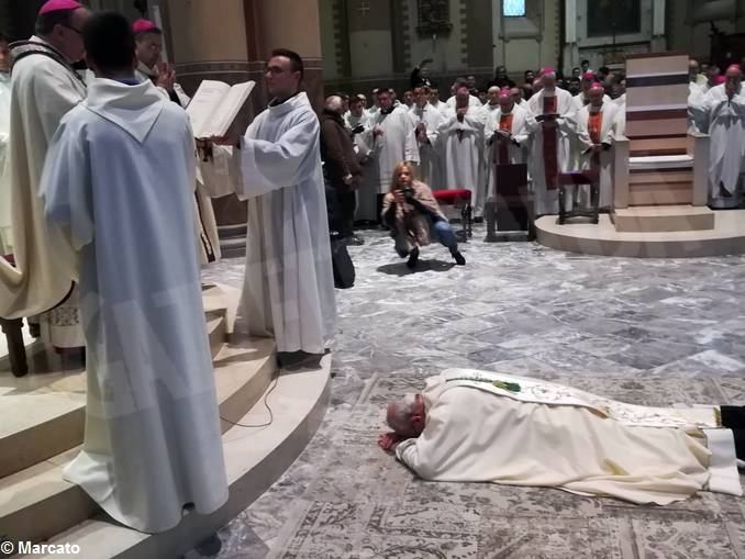 Carissimo Padre Franco, non posso non ricordare a tutti che proprio in questa Cattedrale tu hai ricevuto il dono del Battesimo, iniziando così la vita di Grazia che ti ha condotto fino ad oggi, al giorno in cui, qui, ricevi il dono della pienezza del sacerdozio evocata dai magnifici testi che risuoneranno tra poco nella liturgia dell’Ordinazione. Un evento di preghiera al cuore del quale si apre sul capo del candidato l’Evangeliario, il Libro della Parola di Dio, che deve simbolicamente penetrare in lui.