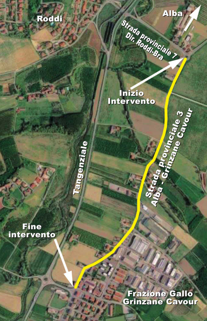 La pista che giungerà da Alba con doppio senso di marcia sarà separata nei pressi della rotatoria di corso Barolo in modo da creare due nuove corsie (una sul lato destro e una sul sinistro) che collegheranno la ciclabile proveniente dalla località Gallo. Gatto aggiunge: «La pista sarà costruita a fianco dell’attuale carreggiata, senza restringere le corsie dedicate al transito veicolare. Era importante ottenere questo esito, perché la strada è stretta e pericolosa e non era pensabile ridurla ulteriormente». La strada provinciale 3, spiegano dagli uffici comunali, risulta percorsa nei giorni feriali – flusso in entrambe le direzioni – da circa 12mila veicoli (dalle ore 8 alle 20 da 850 auto all’ora) che transitano con una velocità media di 70 chilometri orari; sono state rilevate anche punte di 148 km/h da una multa con il telelaser. L’allargamento della strada per costruire un nuovo sedime per la ciclabile prevede: l’utilizzo di aree già dotate di pavimentazione stradale (banchine, spiazzi, reliquati stradali); lo spostamento del fosso di scolo delle acque e l’intubazione dello stesso; la realizzazione di alcune passerelle ciclabili di attraversamento del rio Baracco. Punto di partenza del progetto della nuova pista ciclabile sarà la rotatoria stradale in località Cantina di Roddi, intersezione tra la strada provinciale 7 proveniente da Roddi e la strada numero 3 che collega Alba (corso Barolo) e Grinzane Cavour.