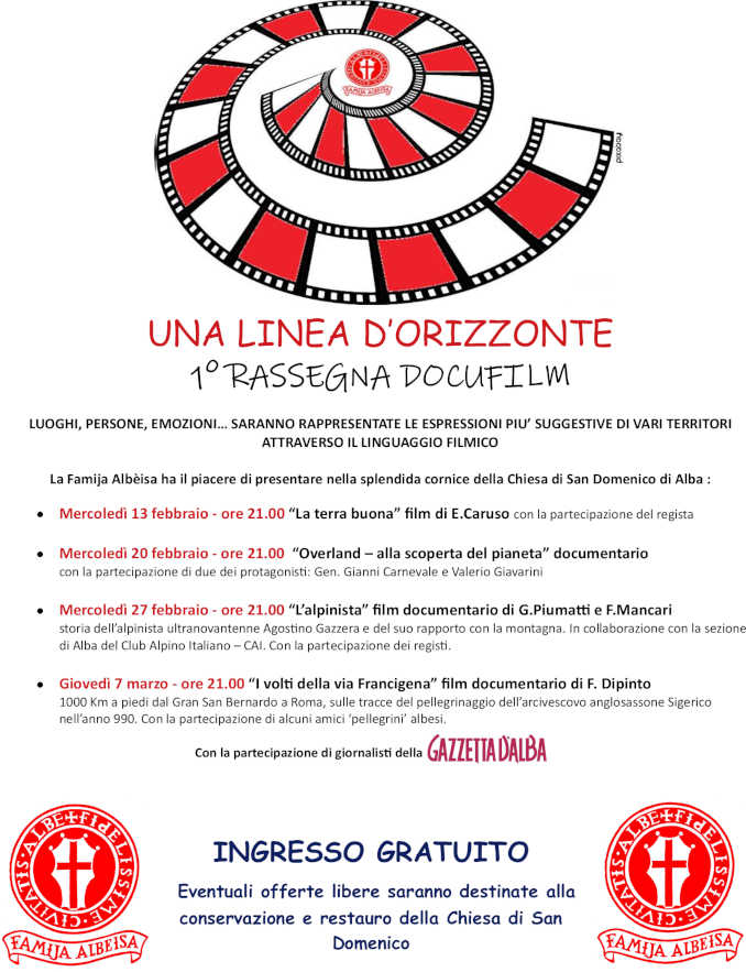 ALBA Parte mercoledì 13 febbraio “Una linea d’orizzonte”, quattro serate nella chiesa di San Domenico presentate dalla Famija albèisa. La prima edizione della rassegna è dedicata a documentari e film locali che spesso non trovano spazio nei circuiti di distribuzione.