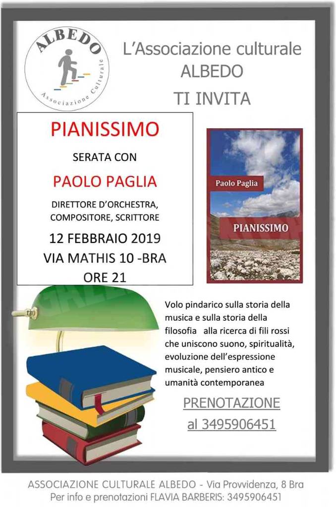 BRA Proseguono gli appuntamenti culturali con l’associazione Albedo. Il nuovo appuntamento con la cultura ha il titolo: Pianissimo e, martedì 12 febbraio alle 21, nella sede di via Mathis 10 presenta Paolo Paglia, direttore d’orchestra, compositore e scrittore. Sarà un volo sulla storia della filosofia alla ricerca dei legami che uniscono suono, spiritualità, evoluzione dell’espressione musicale, pensiero antico e umanità contemporanea.