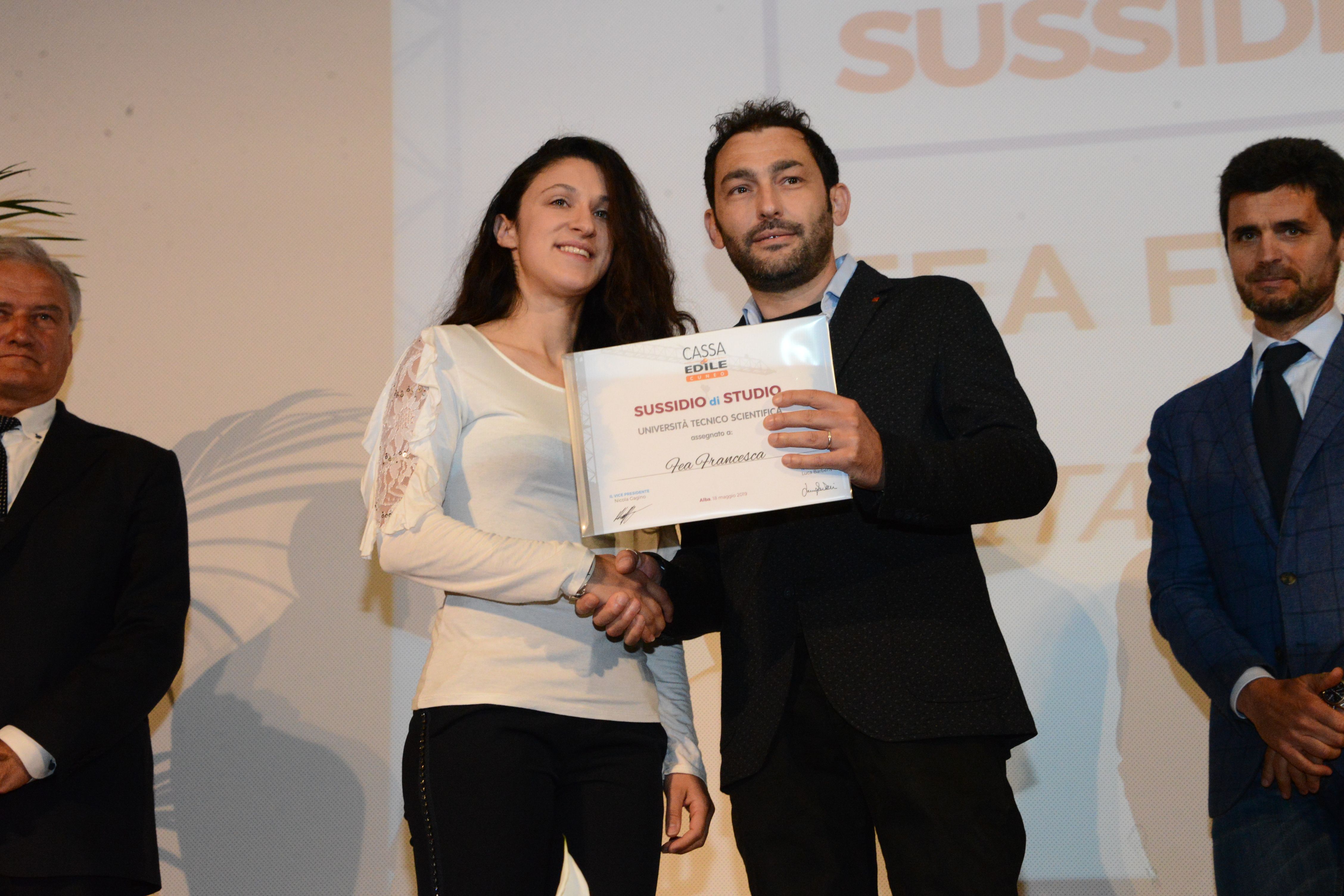 ALBA Si è svolta sabato 18 maggio nella Sala Ordet di Alba l’annuale cerimonia di premiazione della Cassa Edile della provincia di Cuneo nella quale 38 lavoratori sono stati insigniti di una targa e di un assegno di 1500 euro per i loro 30 anni di lavoro nel settore edile, mentre altri 27 hanno ricevuto un attestato ed un assegno di 1000 euro per i loro 25 anni nel comparto. Premiati anche 11 studenti delle scuole medie inferiori, 62 delle medie superiori e 24 universitari meritevoli, lavoratori o figli di lavoratori del settore, con sussidi allo studio per un totale di circa 35 mila euro. Premi e sussidi per circa 120 mila euro elargiti dalla Cassa Edile della provincia di Cuneo a tutela del presente e del futuro del comparto.