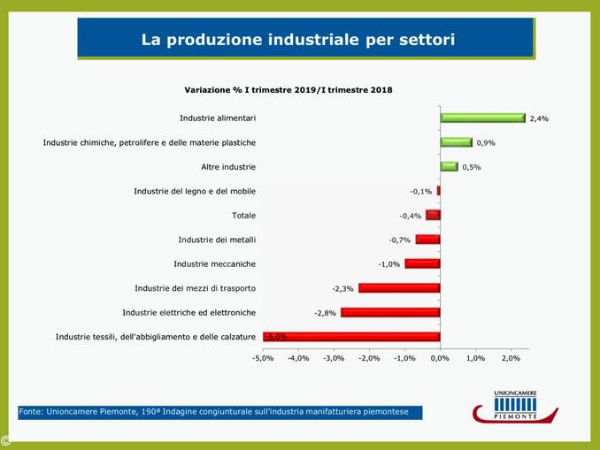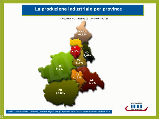 I dati presentati stamattina, 10 giugno, a Torino evidenziano un peggioramento generalizzato della situazione, che però non tocca la Granda e l’Alessandrino, uniche due provincie con andamento positivo, rispettivamente del +0,8% e del +1,2%, trainate dal settore alimentare che segna un +2,4%.